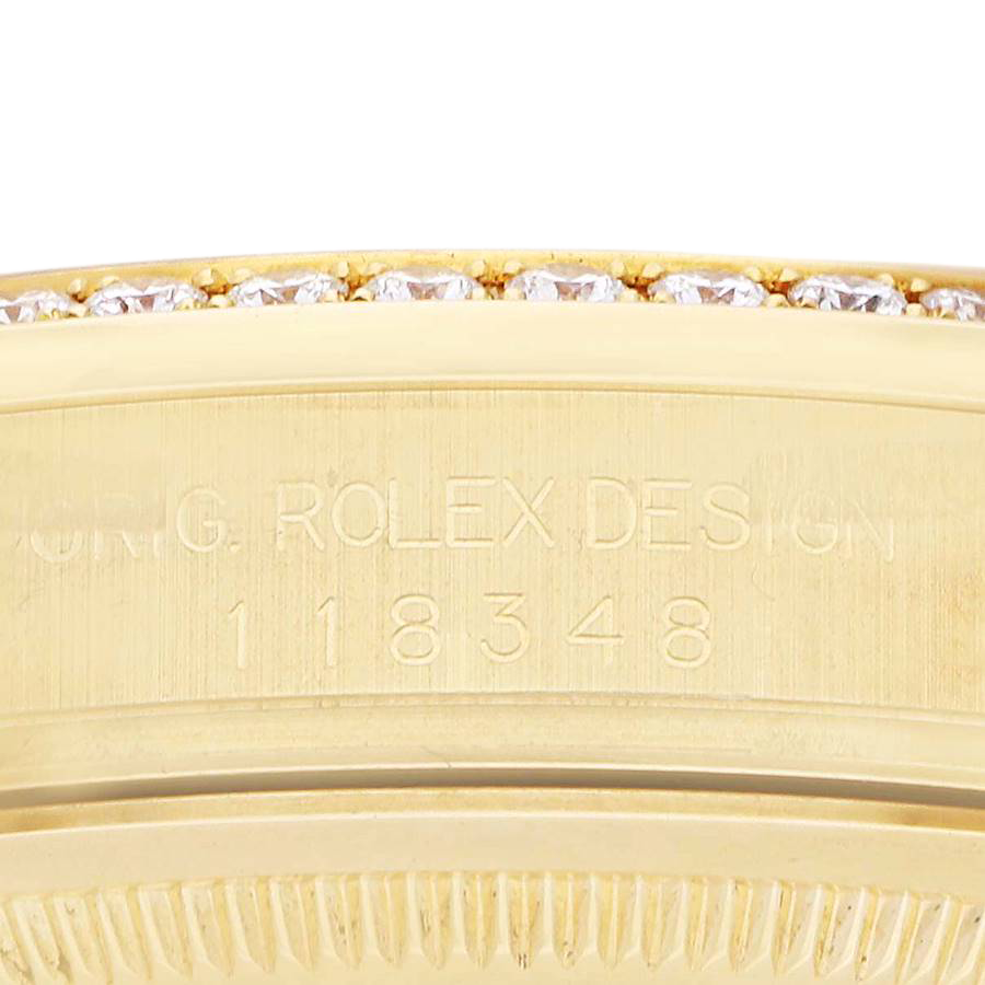 Model Name: Rolex President Day-Date Yellow Gold Diamond Bezel Mens Watch 118348
