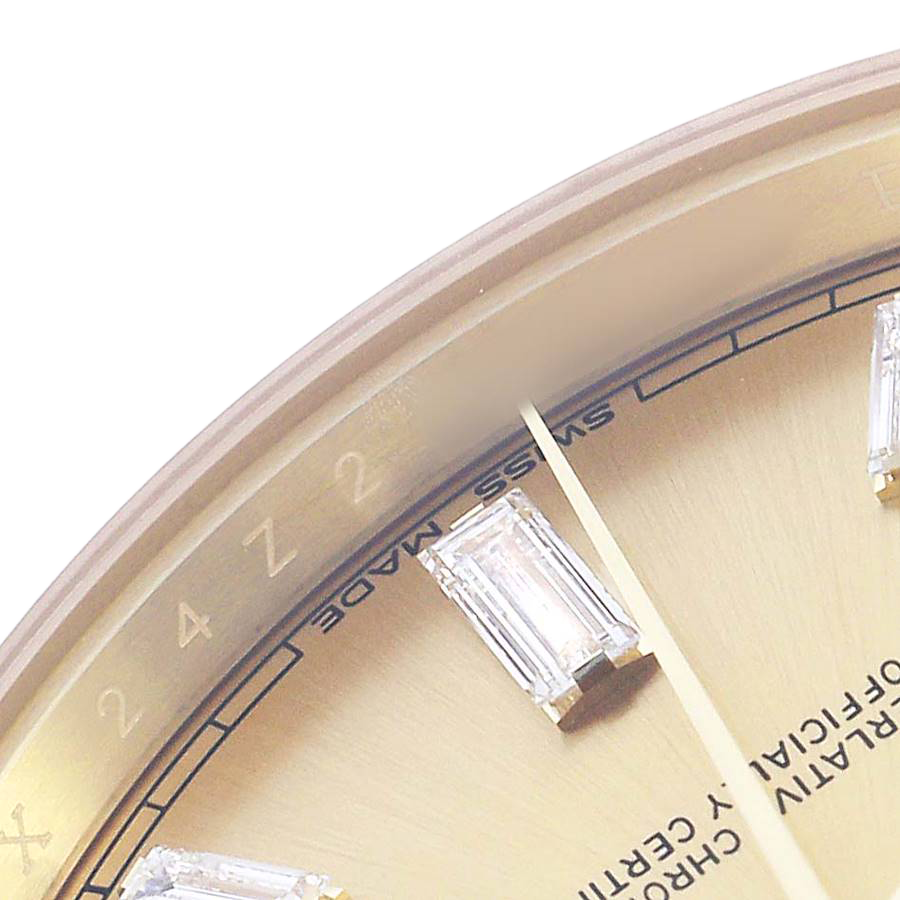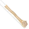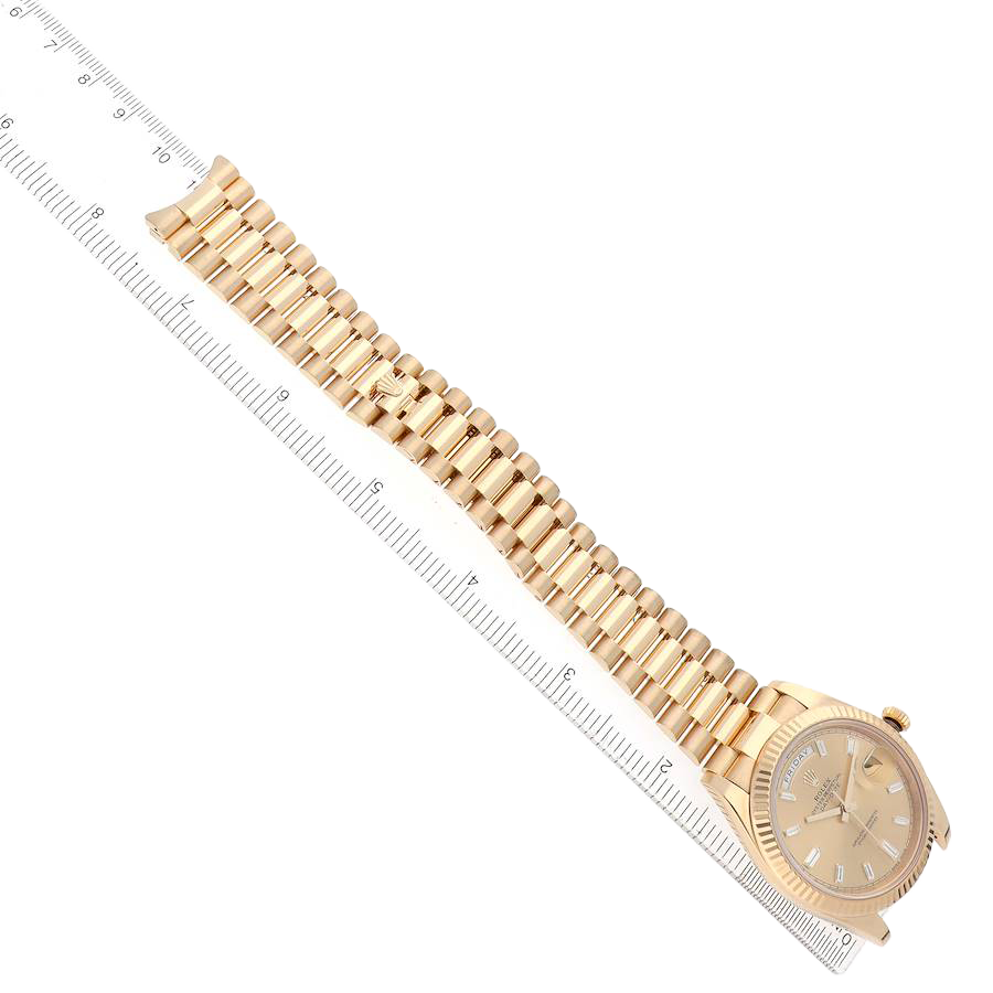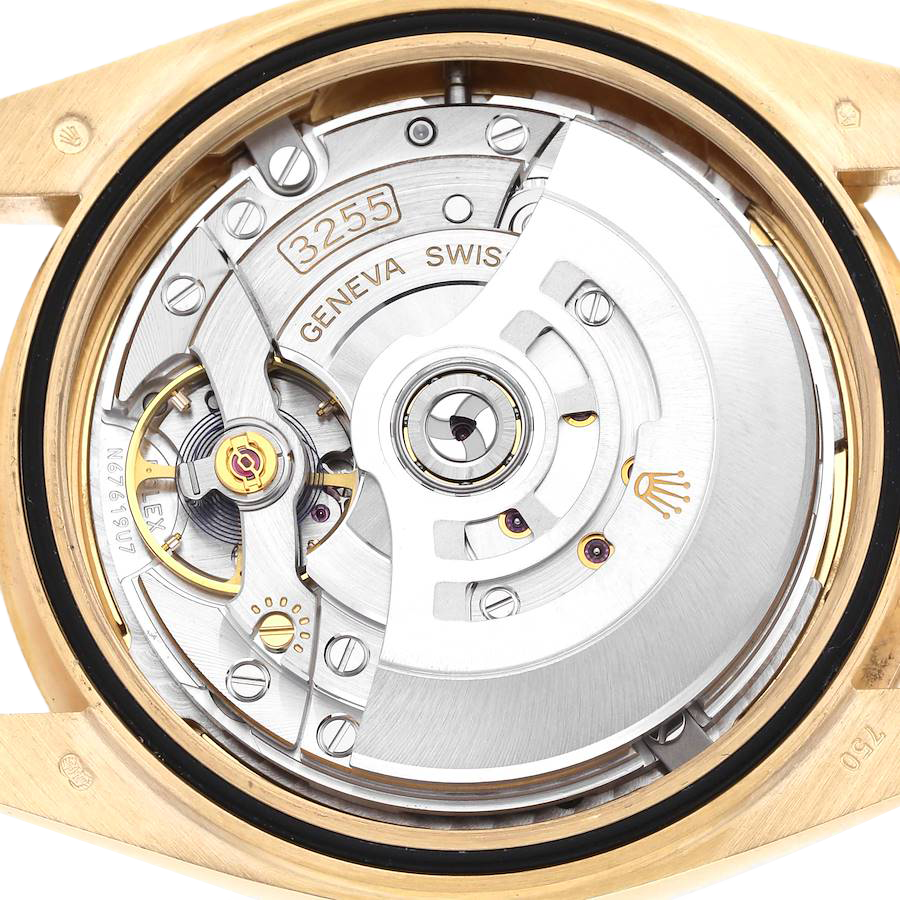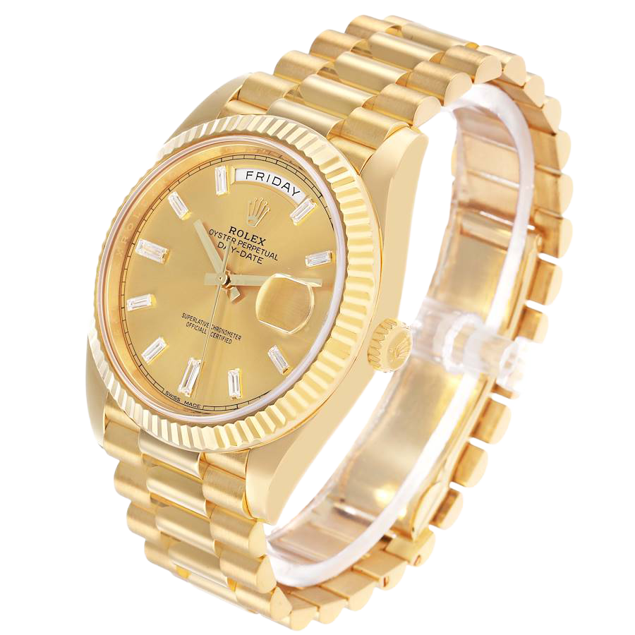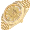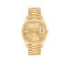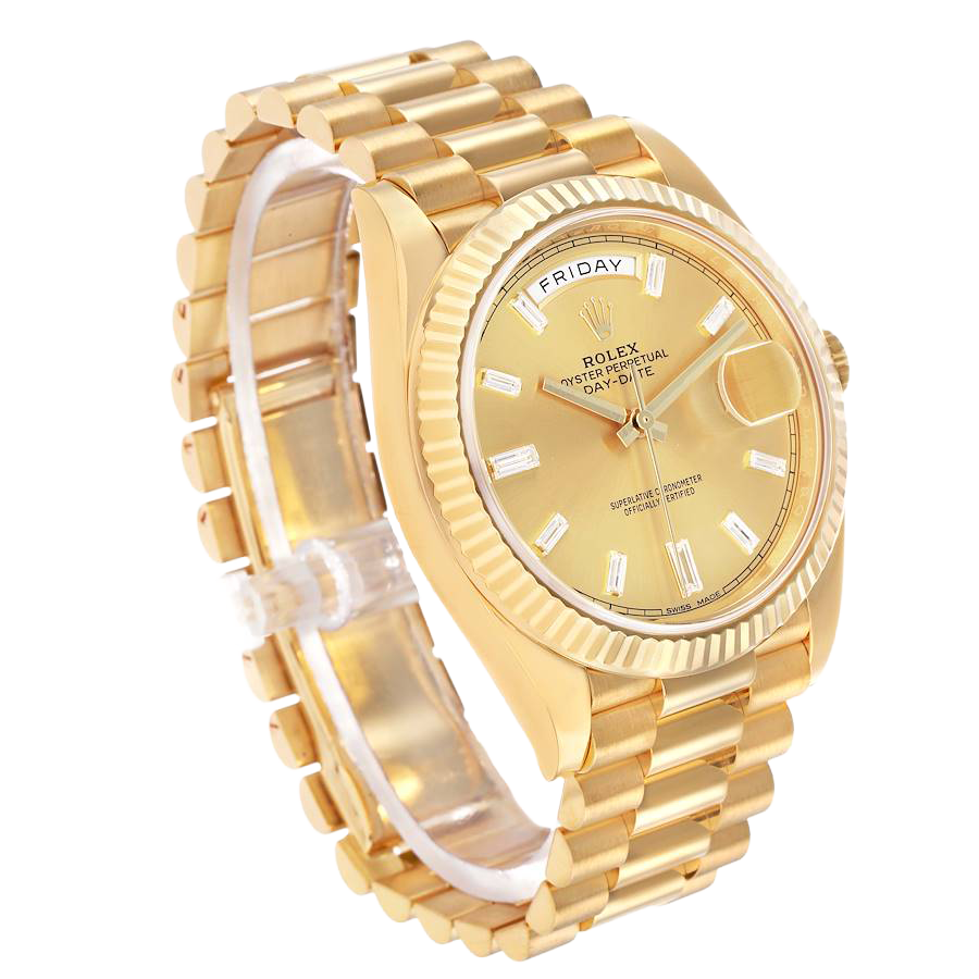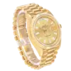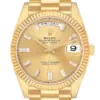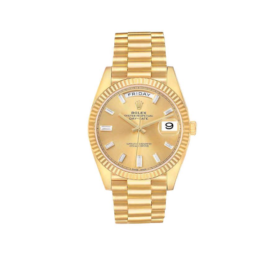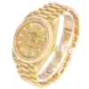The elegant champagne dial enhances the watch’s classic character, complemented by diamond-style hour markers and yellow gold-tone baton hands that create a balanced and premium aesthetic. Signature Day-Date elements include the weekday display at 12 o’clock and the date window at 3 o’clock, preserving the model’s instantly recognizable identity.