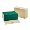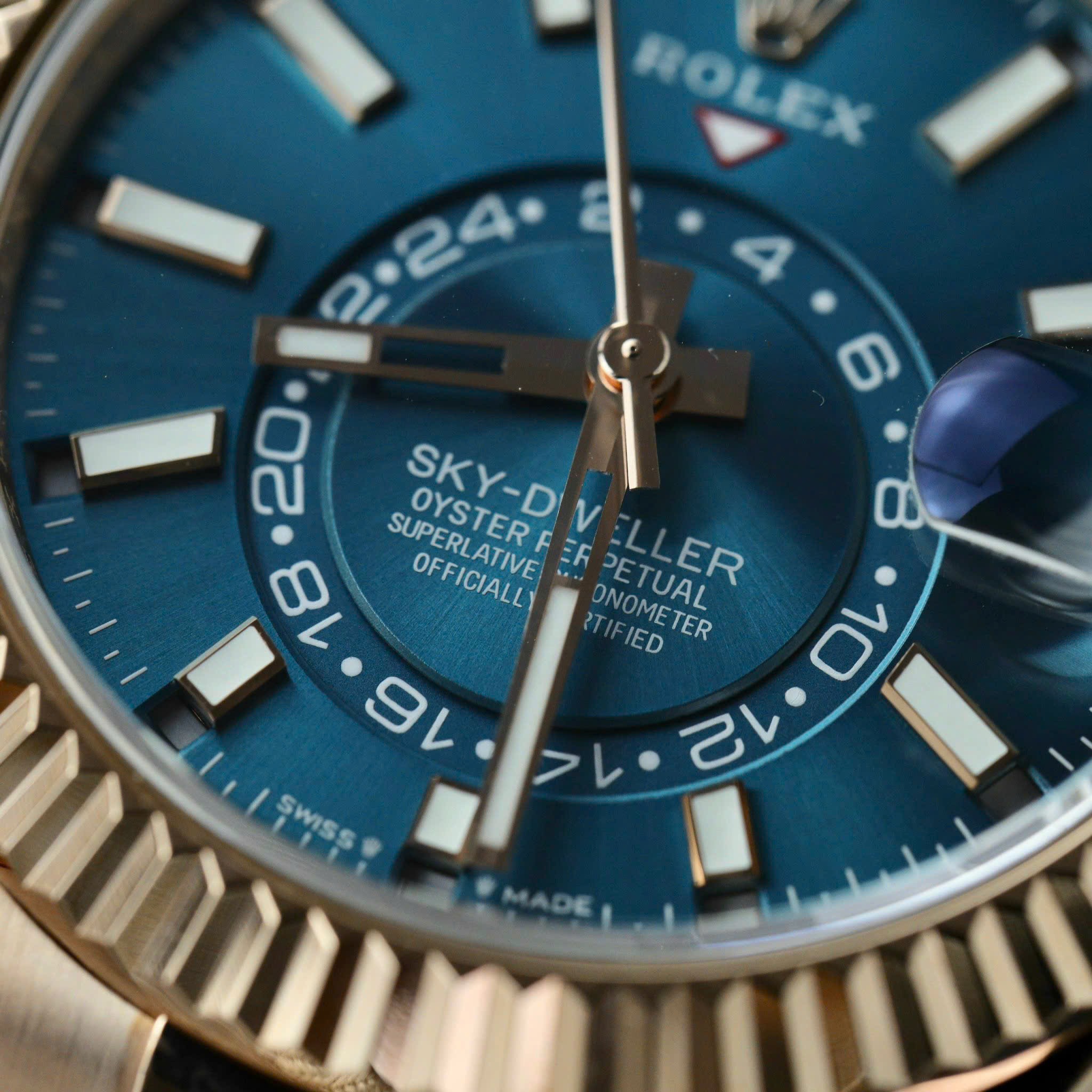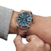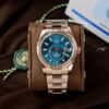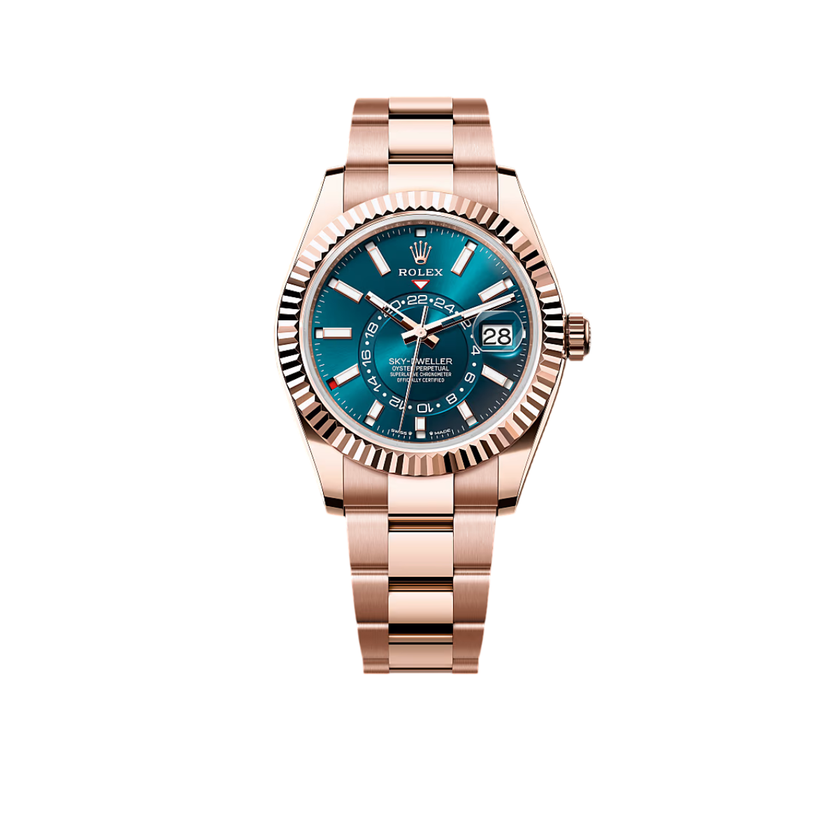 The Rolex Sky-Dweller 336935-0005 marries sophistication and functionality in a masterful design. Crafted from warm 18k Everose gold, its 42 mm case and Jubilee bracelet radiate refined elegance. The blue-green dial — paired with a rotating fluted bezel and “Ring Command” system — allows intuitive control over dual time-zone, date, and annual calendar functions. Powered by the in-house Calibre 9002 with 72-hour power reserve, the watch ensures accurate timekeeping and reliability. With sapphire crystal, Cyclops date lens, and 100 m water resistance, it’s the ideal companion for a modern, globetrotting gentleman who values both prestige and practicality.