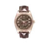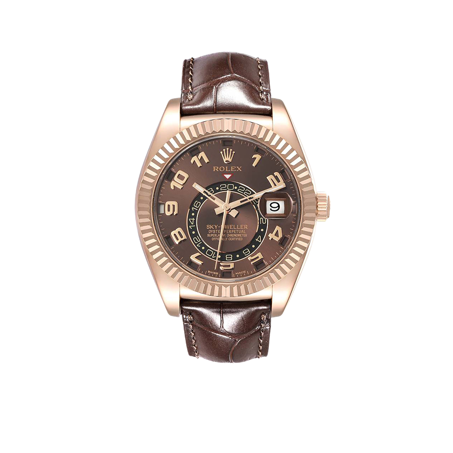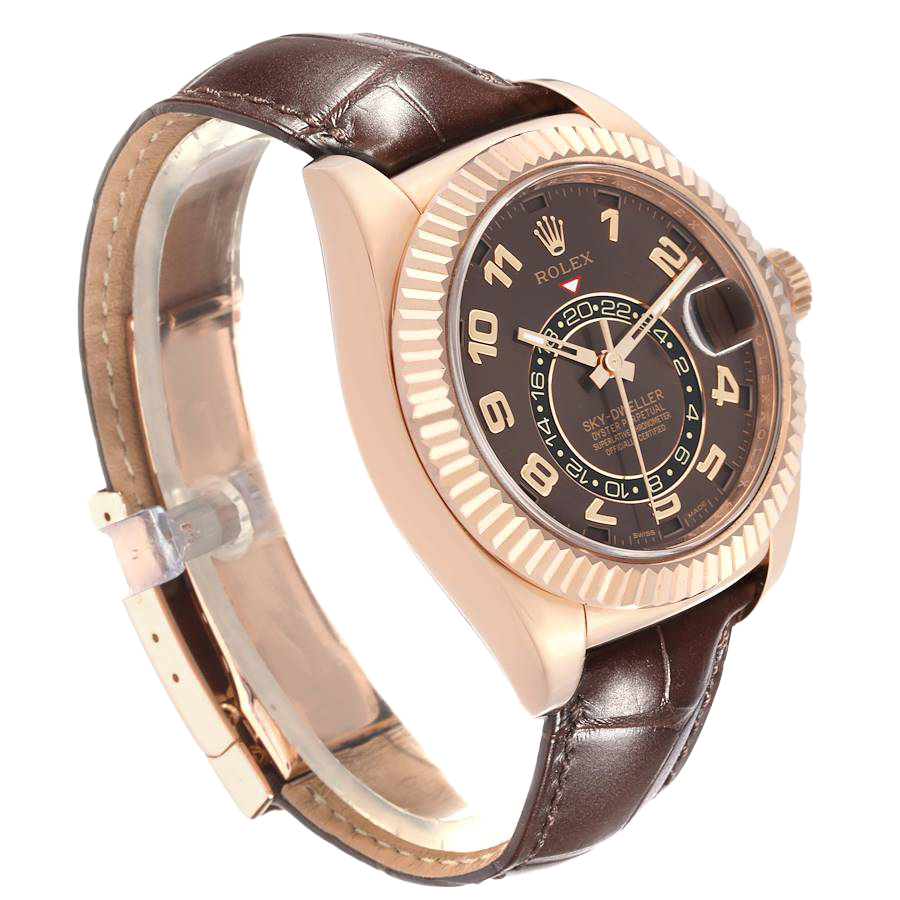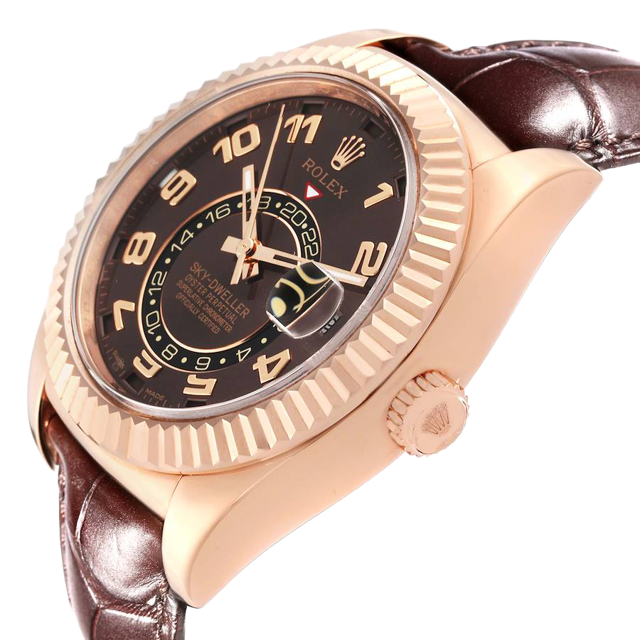 Rolex Sky-Dweller Everose Chocolate Brown Dial Rose Gold Watch 326135 Box Card. Officially certified chronometer automatic self-winding movement. 18K rose gold case 42.0 mm in diameter. Rolex logo on a screw-down twinlock crown. 18K rose gold fluted rotatable ring command bezel. Scratch resistant sapphire crystal with cyclops magnifier. 18K rose gold fluted rotatable ring command bezel. Chocolate brown dial with raised rose gold arabic numerals. Centre hour, minute and seconds hands. 24-hour display on off-centre disc. Second time zone. Instantaneous annual calendar at 3 o’clock and rapid-setting of the date. Month display via 12 apertures around the circumference of the dial.