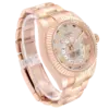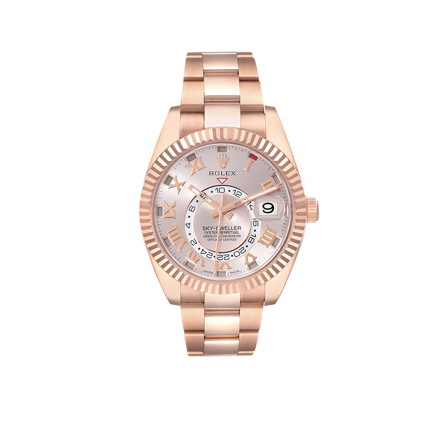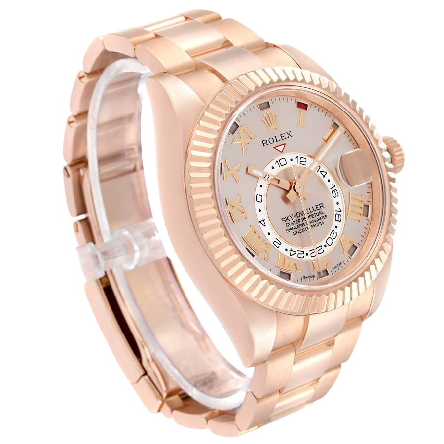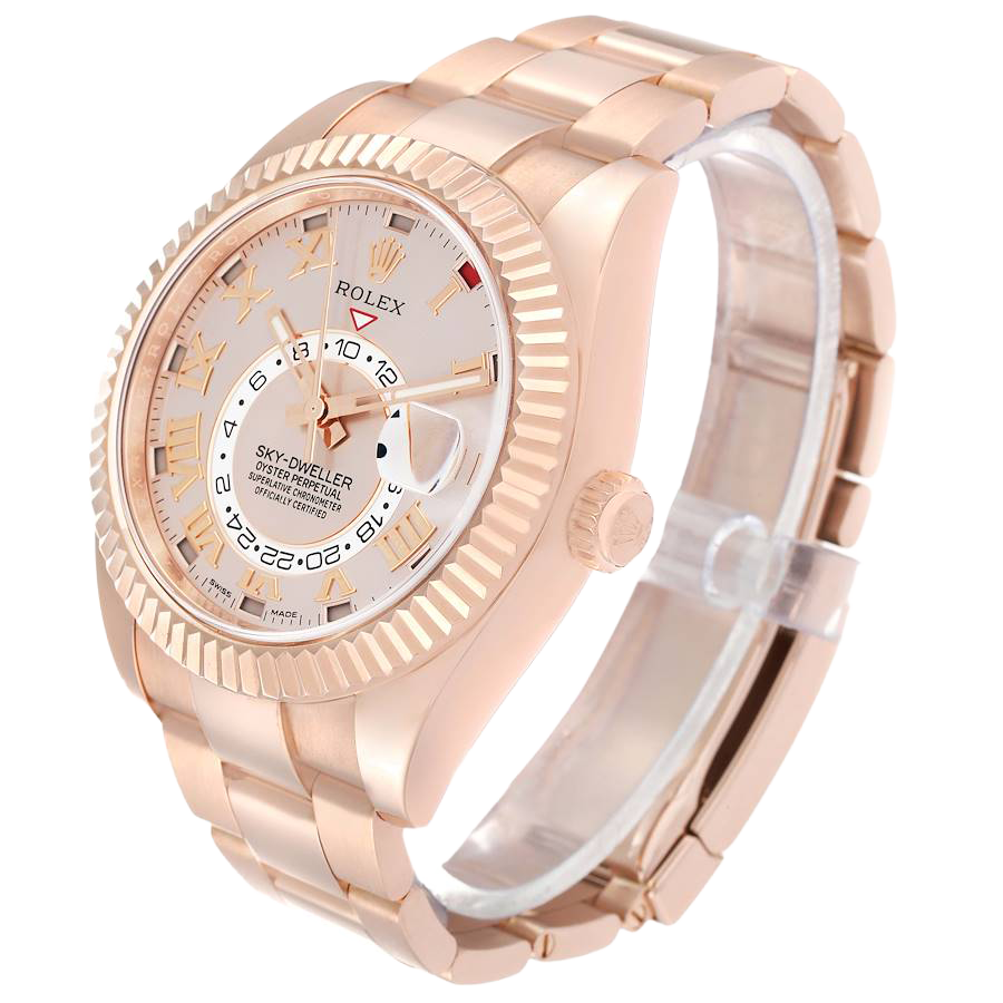 Rolex Sky-Dweller Rose Gold Sundust Dial Mens Watch 326935. Officially certified chronometer automatic self-winding movement. 18k rose gold case 42.0 mm in diameter. Rolex logo on a screw-down twinlock crown. 18K rose gold fluted rotatable ring command bezel. Scratch resistant sapphire crystal with cyclops magnifier. Sundust rose dial with rose gold Roman numeral hour markers. Centre hour, minute and seconds hands. 24-hour display on off-centre disc. Second time zone. Instantaneous annual calendar at 3 o’clock and rapid-setting of the date. Month display via 12 apertures around the circumference of the dial. 18k rose gold oyster bracelet with folding oysterclasp.