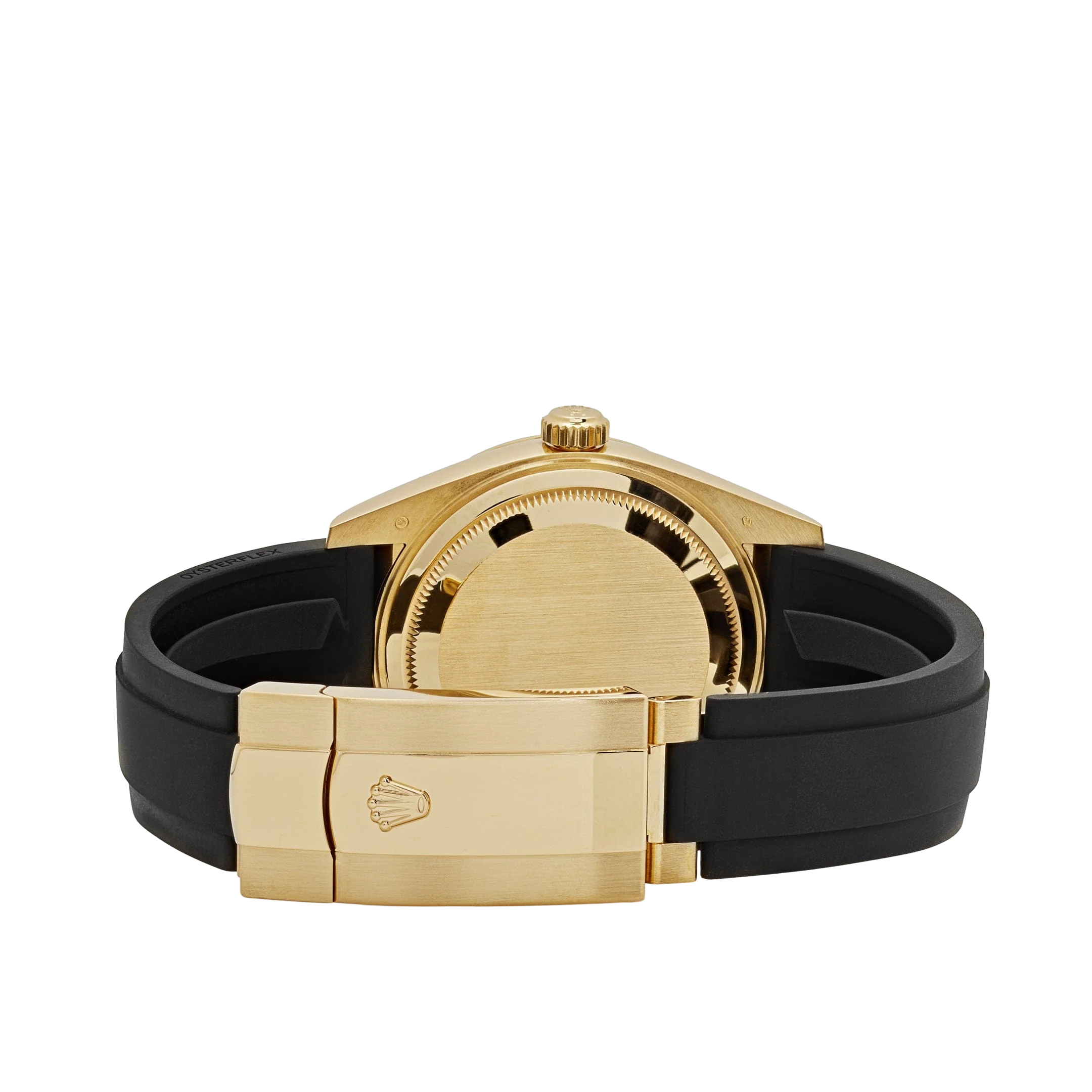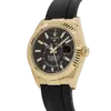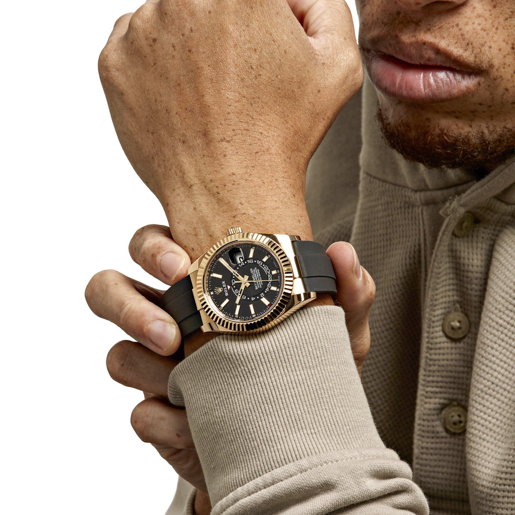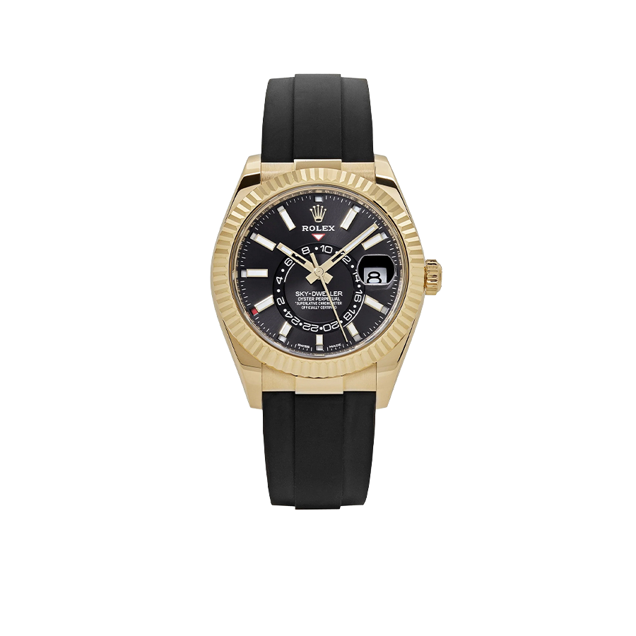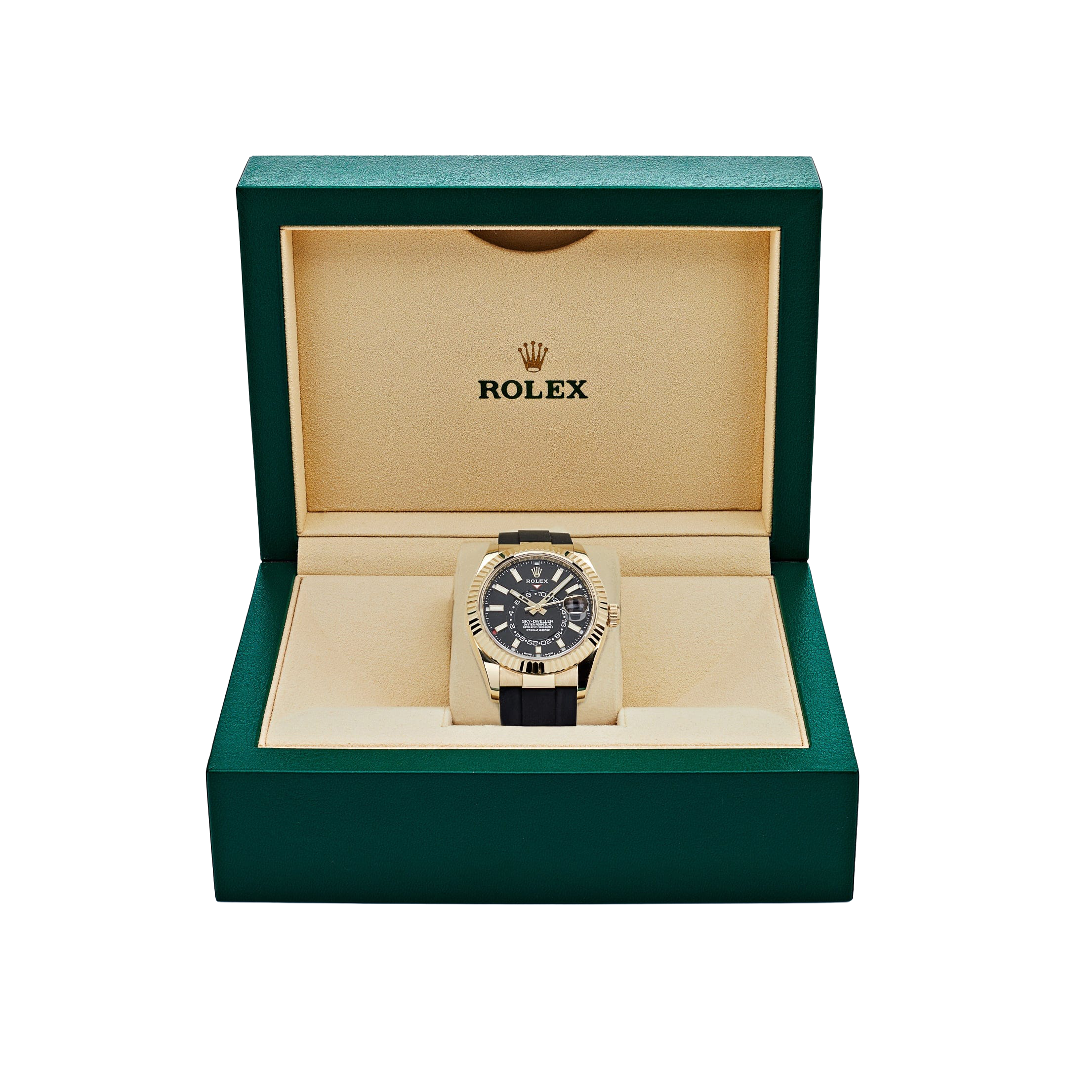 This Rolex Sky-Dweller features dual time zones, inlaid in a 42mm yellow gold case featuring a black dial with luminous hour markers and the signature yellow gold fluted bezel.The Ring Command bezel can be rotated to select the date, the local time and the reference time, which can then be adjusted in either direction using the winding crown. The Oysterflex bracelet combines the specialties of a metal bracelet and high performance elastomer with oysterclasp to ensure flexibility and comfort.
