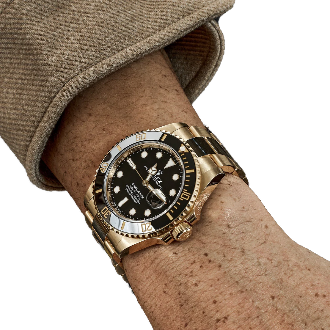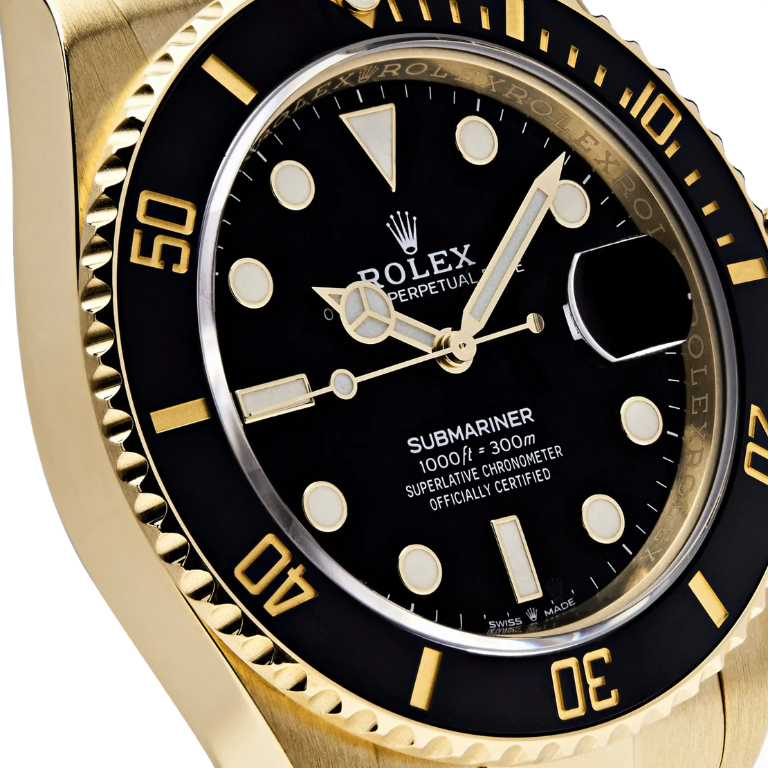 Dial: Black dial with luminescent-inlay yellow gold dot hour markers and Mercedes hands. Luminescent lollipop-tipped sweeping seconds hand. Outer stick minute markers. Date calendar at the 3 o’clock aperture.