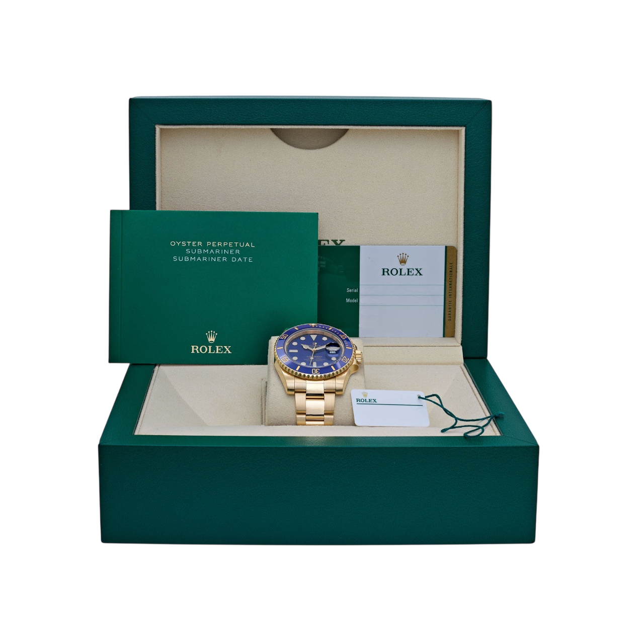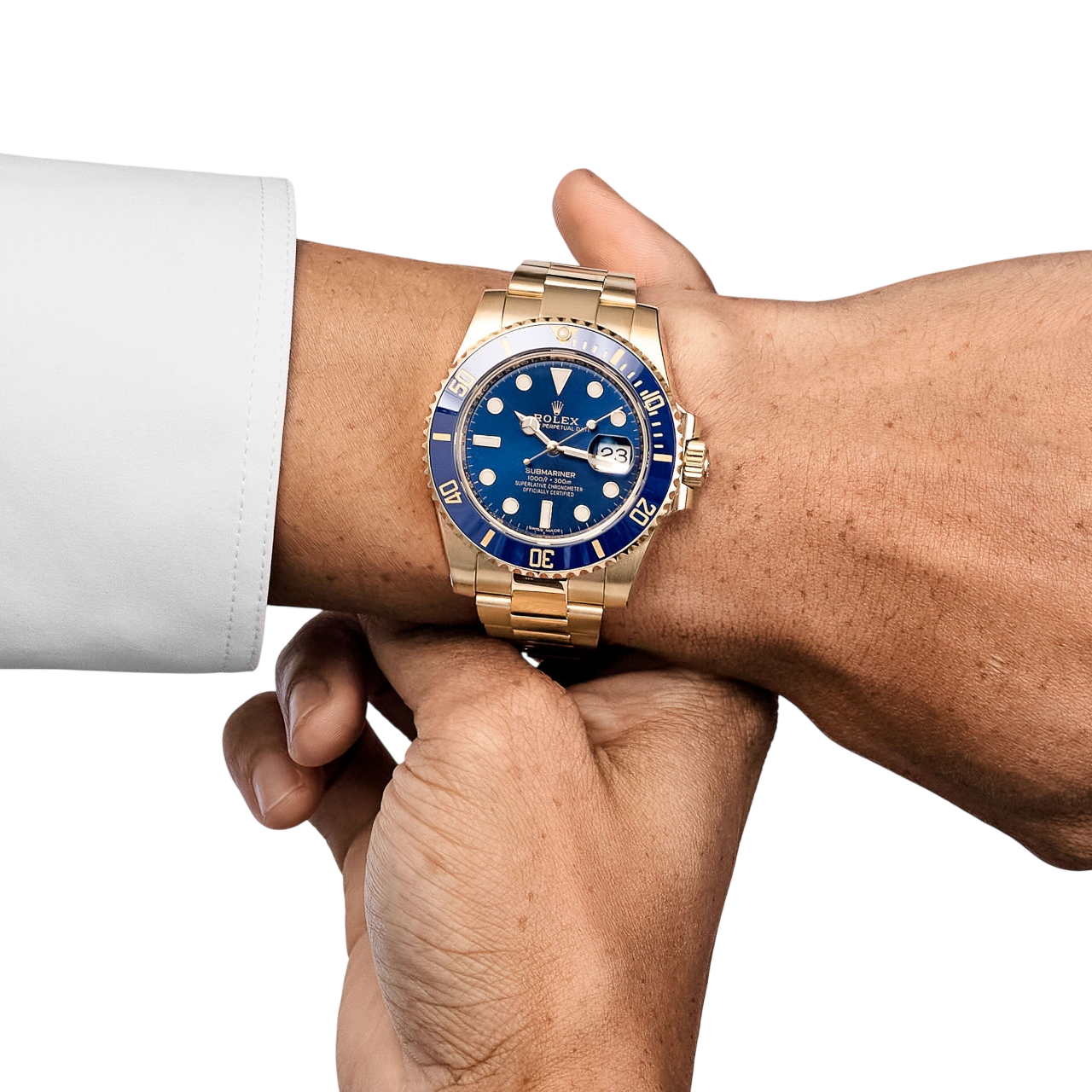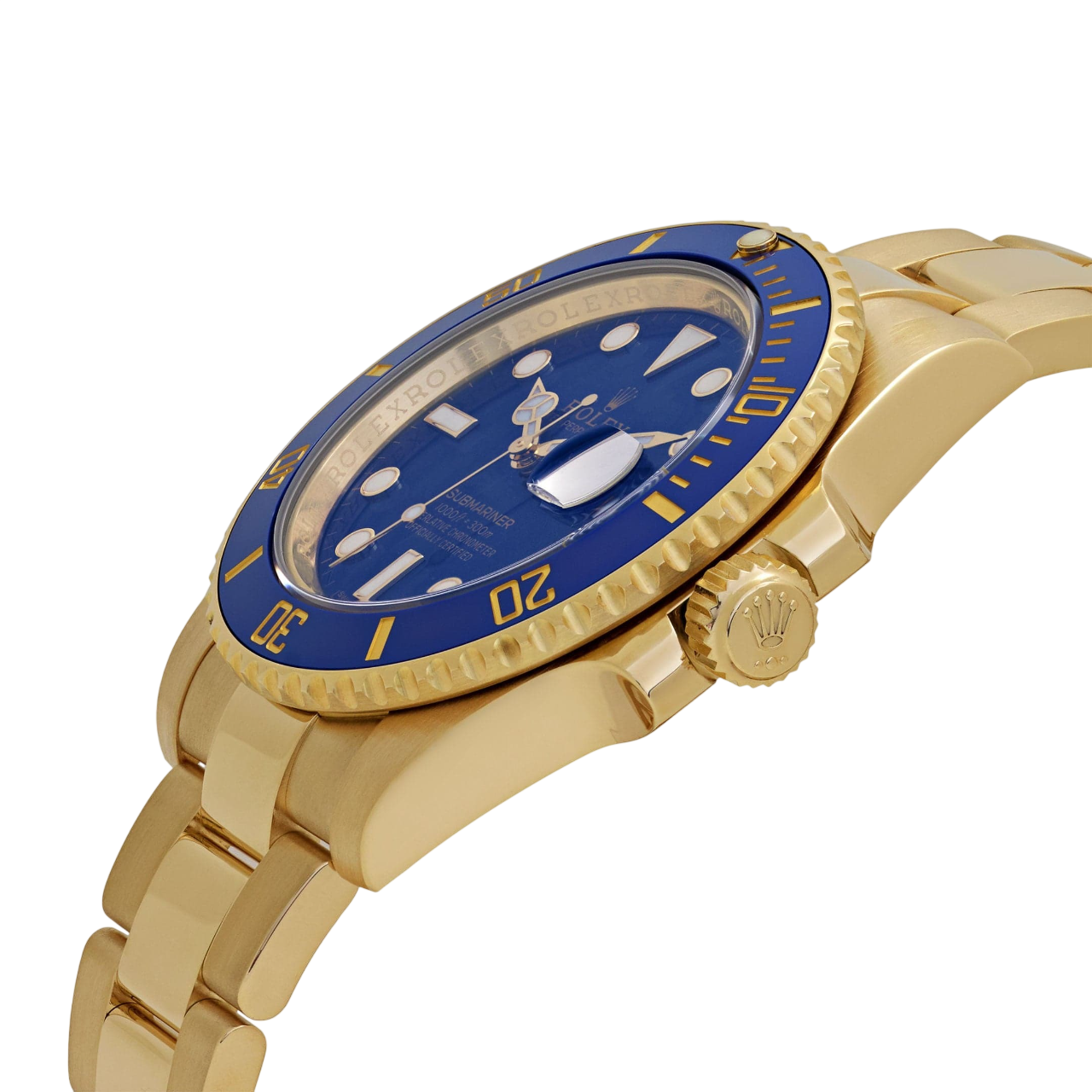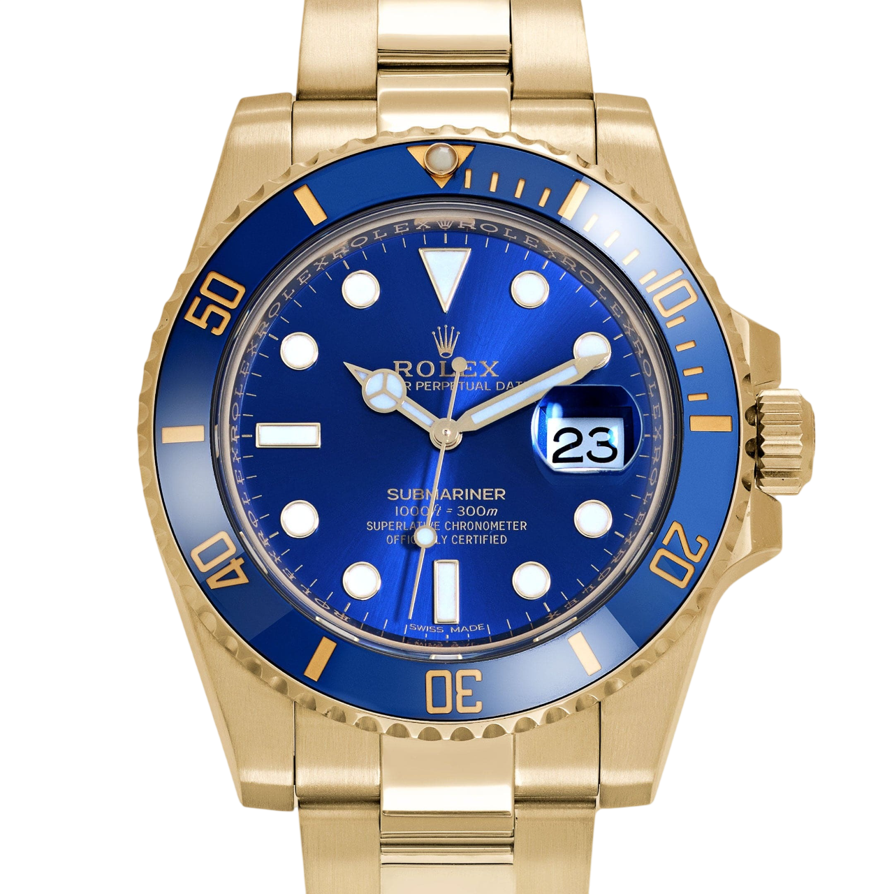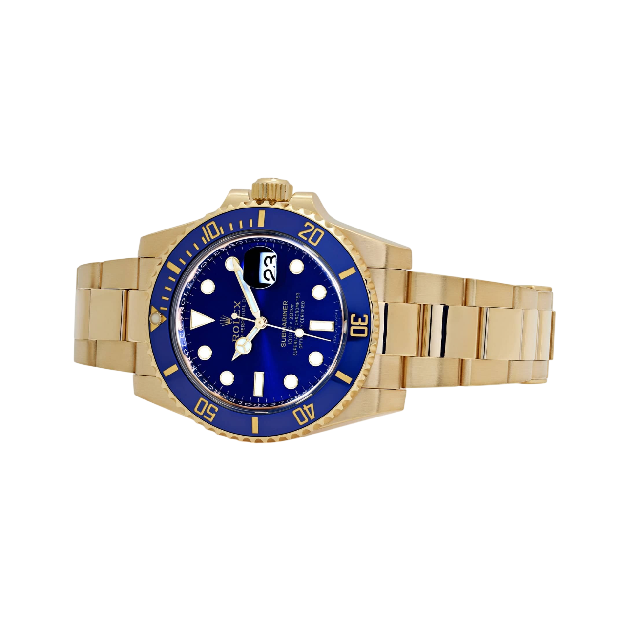 Dial: Royal Blue dial with luminescent-inlay yellow gold dot hour markers and Mercedes hands. Date calendar at the 3 o’clock aperture.