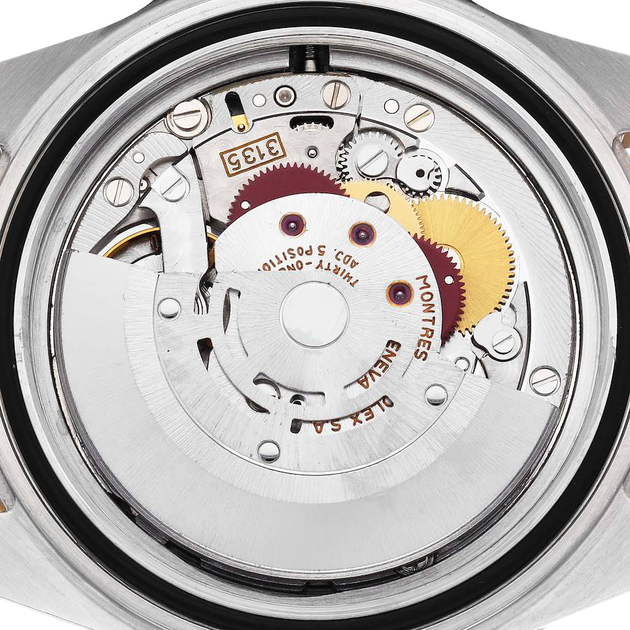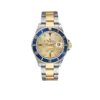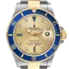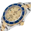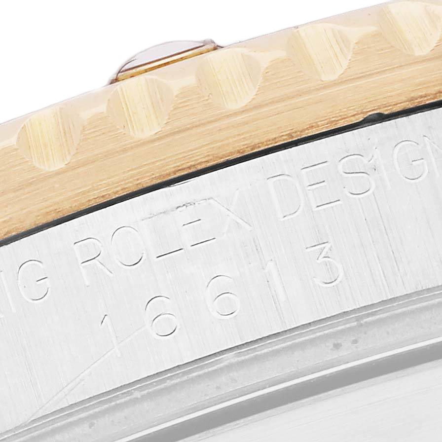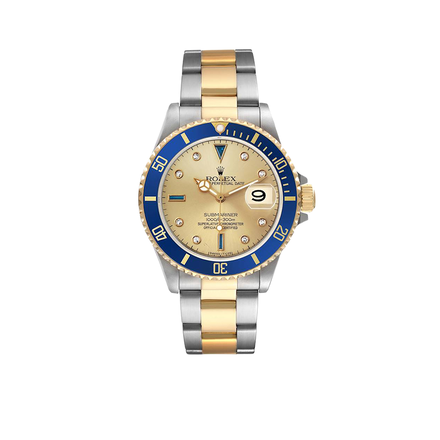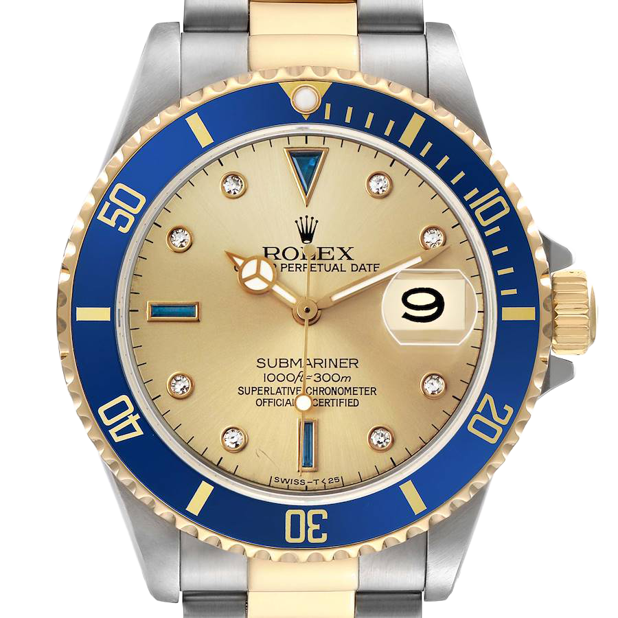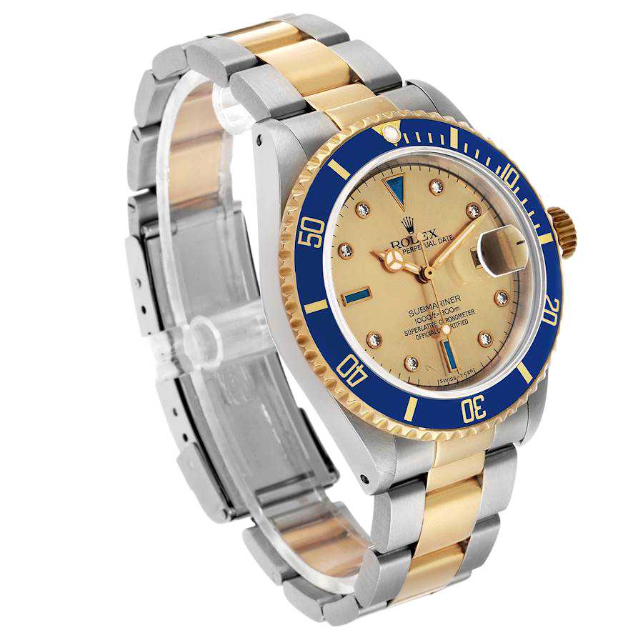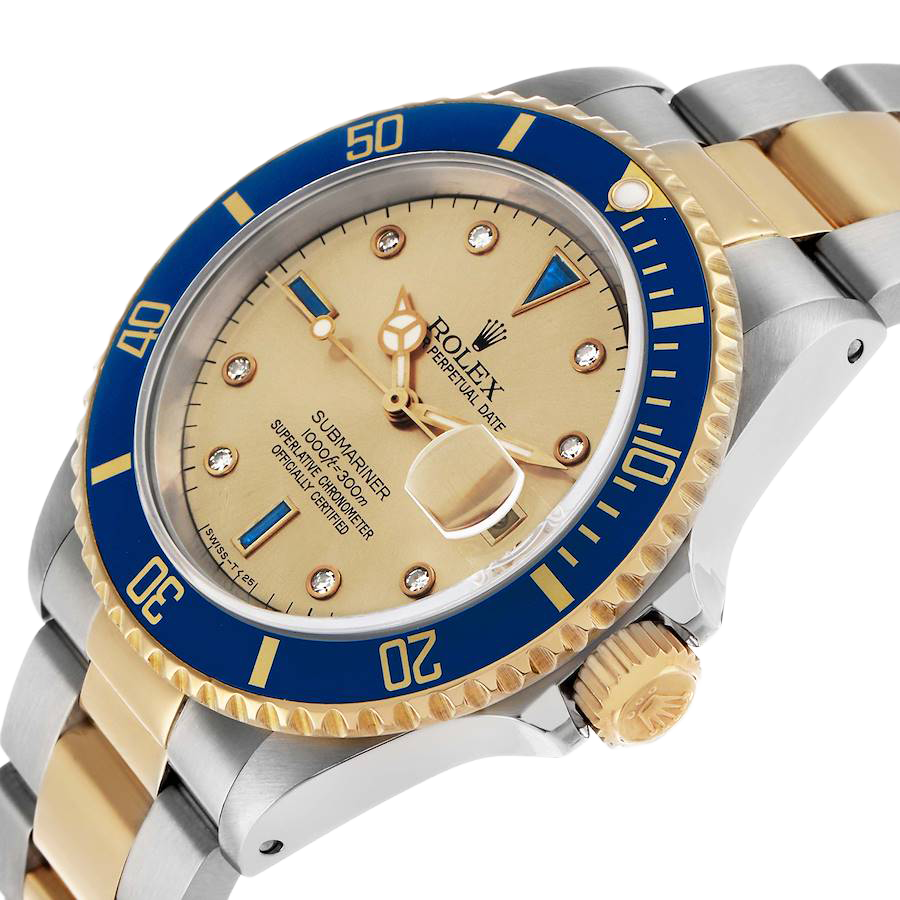 Rolex Submariner Steel Yellow Gold Diamond Serti Mens Watch 16613. Officially certified chronometer automatic self-winding movement. Stainless steel and 18k yellow gold oyster case 40.0 mm in diameter. Rolex logo on the 18k yellow gold crown. Pointed crown guards. Blue insert special time-lapse unidirectional rotating yellow gold bezel. Scratch resistant sapphire crystal with a cyclops magnifier. Champagne dial with original Rolex factory diamond and sapphire hour markers. Luminescent yellow gold Mercedes hands. Luminescent yellow gold lollipop-tipped sweeping seconds hand. Date calendar at the 3 o’clock aperture. Outer stick minute markers. Stainless steel and 18k yellow gold oyster bracelet with a flip-lock clasp.