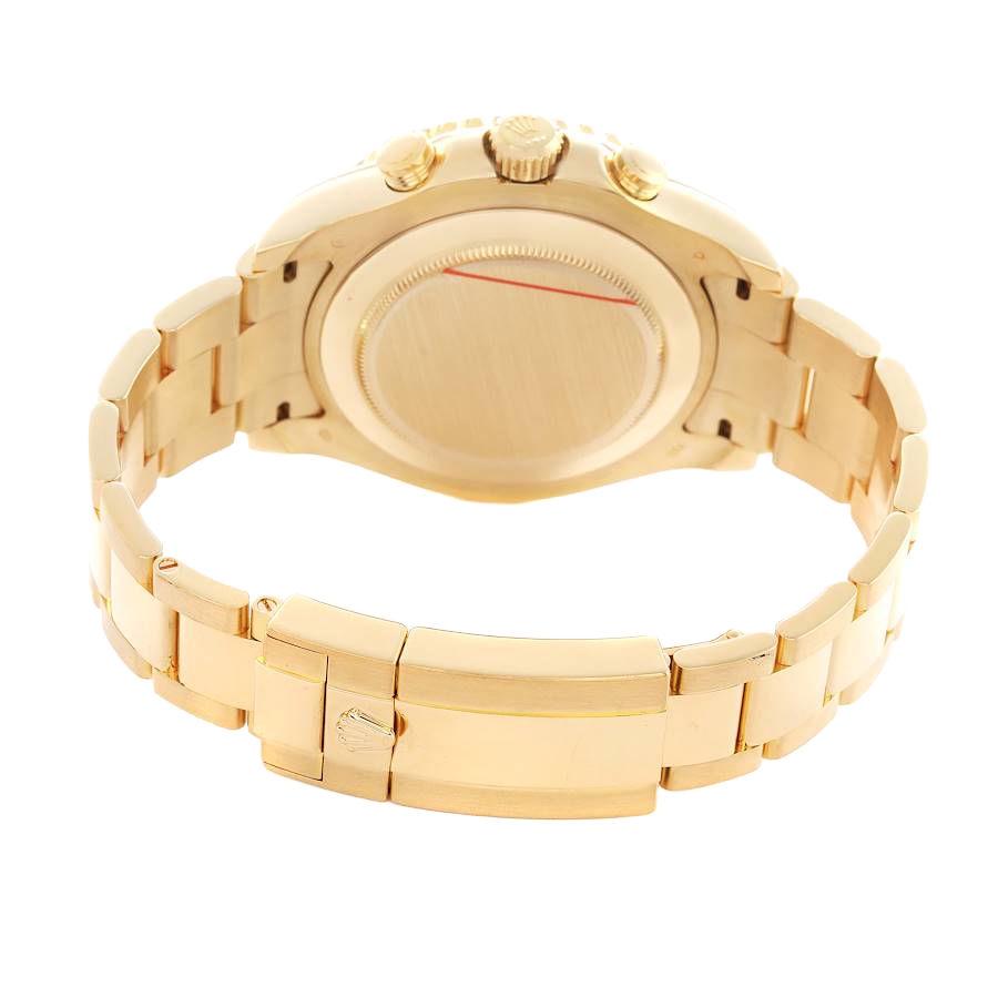 Case: 18K yellow gold oyster case 44.0 mm in diameter. Two 18k yellow gold pushers operate the chronograph functions. Pointed crown guards. Rolex logo on the 18k yellow gold screw-down crown.